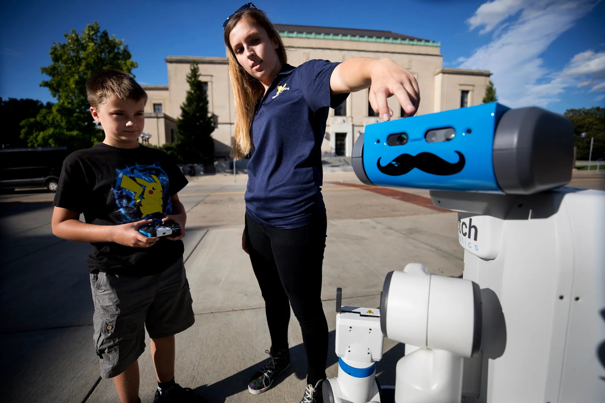 Elizabeth Olsen, robotics PhD student, teaches Andrei Irwin, 6, about a robot from the Laboratory for Progress on Ingalls Mall